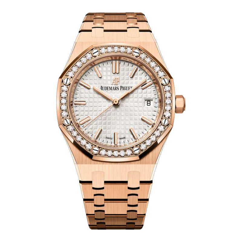 Audemars Piguet launches its first 34 mm Selfwinding Royal Oak. The silver-toned “Grande Tapisserie” dial of this 18-carat pink gold model is adorned with a diamond-set bezel.