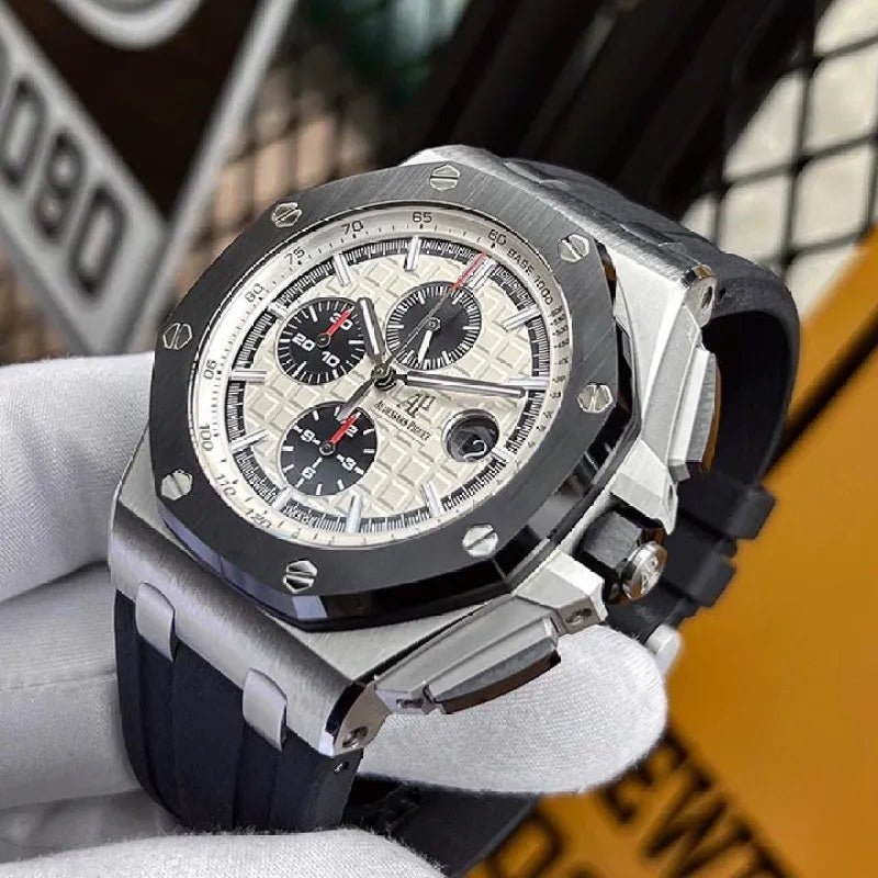 Audemars Piguet Royal Oak Offshore Chronograph (26400SOOOA002CA01) self-winding automatic watch, features a 44mm stainless steel case with a black ceramic bezel surrounding a silver Mega Tapiserrie dial on a black rubber strap with a stainless steel tang buckle. Functions include hours, minutes, small seconds, date, chronograph and tachymeter.