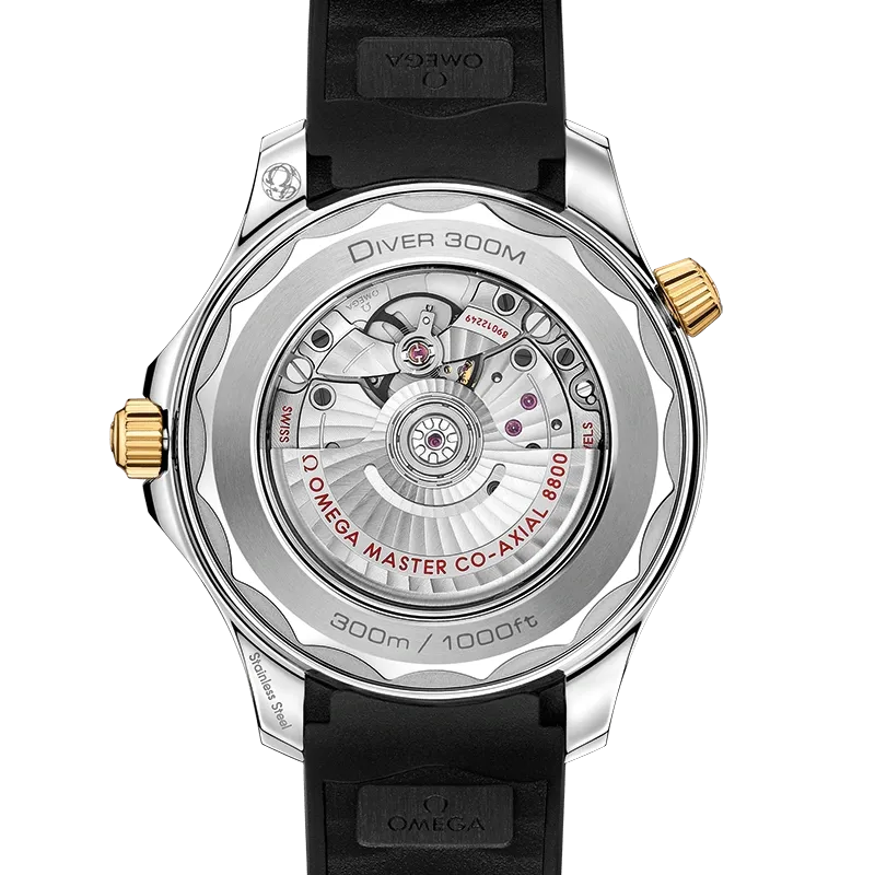 The watch is presented on a black rubber strap and is driven by the OMEGA Master Chronometer Calibre 8800, which can be seen through the sapphire-crystal on the wave-edged caseback.