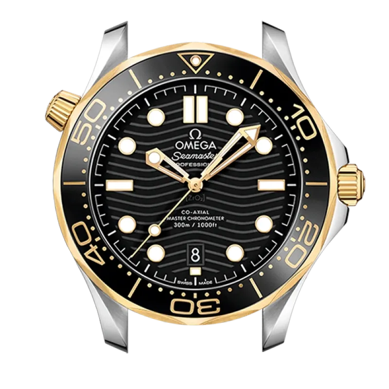 The skeleton hands and raised indexes are 18K yellow gold and are filled with white Super-LumiNova, while the helium escape valve has been given a conical design.
