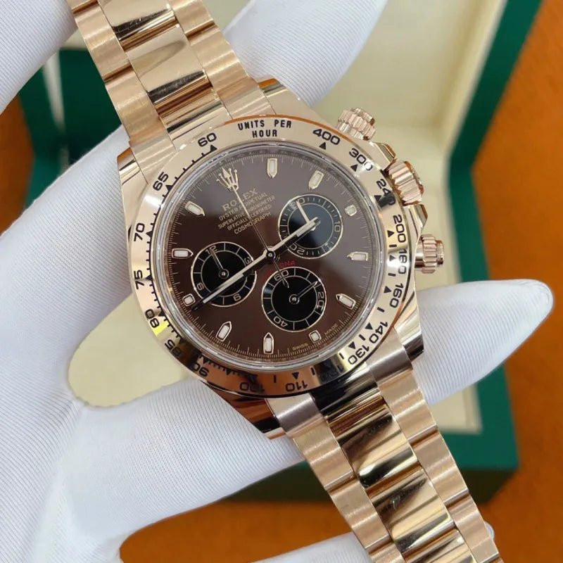 THIS OYSTER PERPETUAL COSMOGRAPH DAYTONA IN 18 CT EVEROSE GOLD, WITH A CHOCOLATE AND BLACK DIAL AND AN OYSTER BRACELET, FEATURES AN 18 CT EVEROSE GOLD BEZEL WITH ENGRAVED TACHYMETRIC SCALE.
