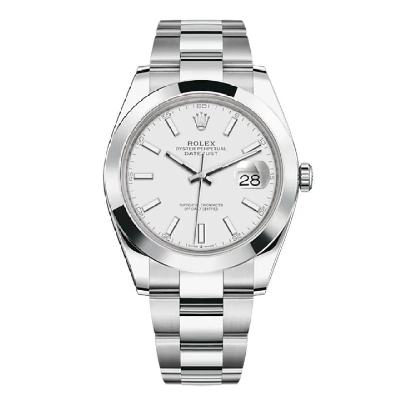 THIS OYSTER PERPETUAL DATEJUST 41 IN OYSTERSTEEL FEATURES A WHITE DIAL AND AN OYSTER BRACELET.