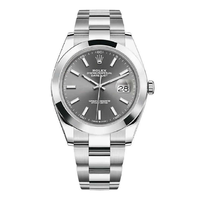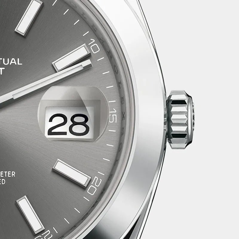 THIS OYSTER PERPETUAL DATEJUST 41 IN OYSTERSTEEL FEATURES A SLATE DIAL AND AN OYSTER BRACELET.
