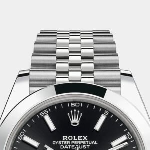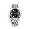 THIS OYSTER PERPETUAL DATEJUST 41 IN OYSTERSTEEL FEATURES A BRIGHT BLACK DIAL AND A JUBILEE BRACELET.