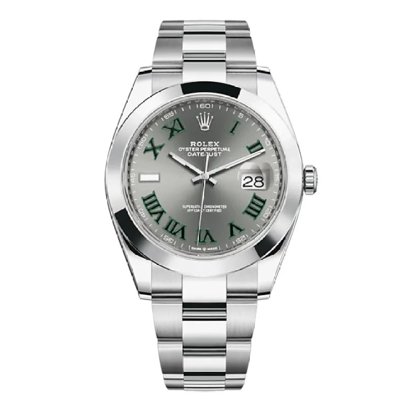 THIS OYSTER PERPETUAL DATEJUST 41 IN OYSTERSTEEL FEATURES A SLATE DIAL AND AN OYSTER BRACELET.