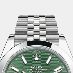 THIS OYSTER PERPETUAL DATEJUST 41 IN OYSTERSTEEL FEATURES A MINT GREEN, FLUTED-MOTIF DIAL AND A JUBILEE BRACELET.