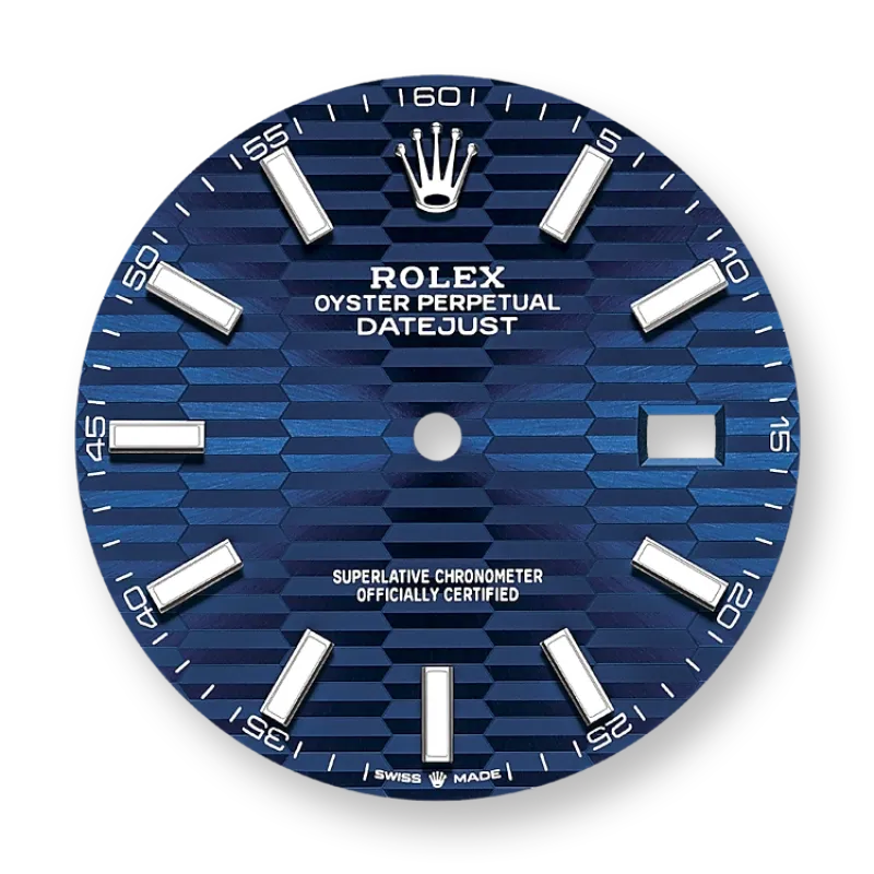 THIS OYSTER PERPETUAL DATEJUST 41 IN OYSTERSTEEL FEATURES A BRIGHT BLUE, FLUTED-MOTIF DIAL AND A JUBILEE BRACELET.