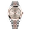 THIS OYSTER PERPETUAL DATEJUST 41 IN OYSTERSTEEL AND EVEROSE GOLD FEATURES A SUNDUST DIAL AND A JUBILEE BRACELET.