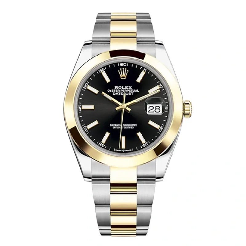 THIS OYSTER PERPETUAL DATEJUST 41 IN OYSTERSTEEL AND YELLOW GOLD FEATURES A BRIGHT BLACK DIAL AND AN OYSTER BRACELET.