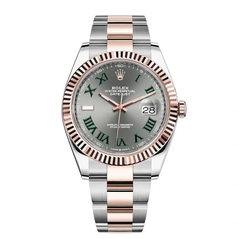 THIS OYSTER PERPETUAL DATEJUST 41 IN OYSTERSTEEL AND EVEROSE GOLD FEATURES A SLATE DIAL AND AN OYSTER BRACELET.