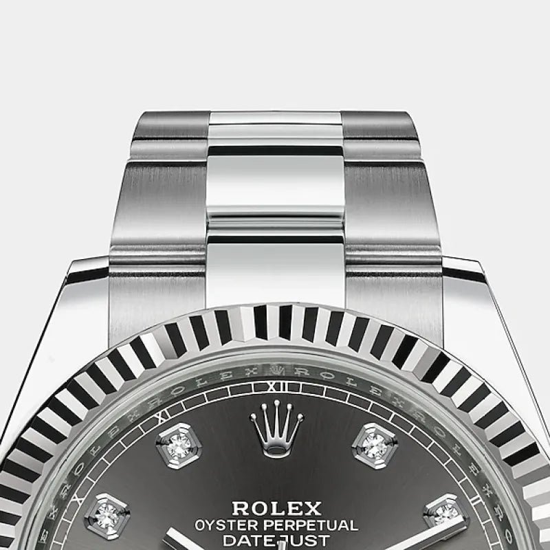 THIS OYSTER PERPETUAL DATEJUST 41 IN OYSTERSTEEL AND WHITE GOLD FEATURES A SLATE, DIAMOND-SET DIAL AND AN OYSTER BRACELET.、