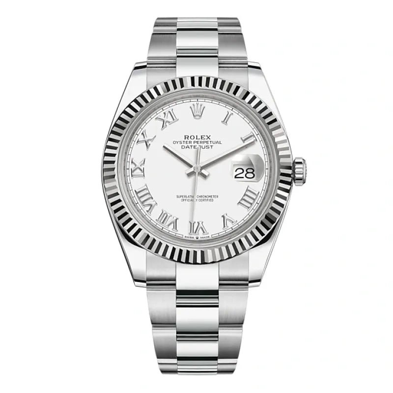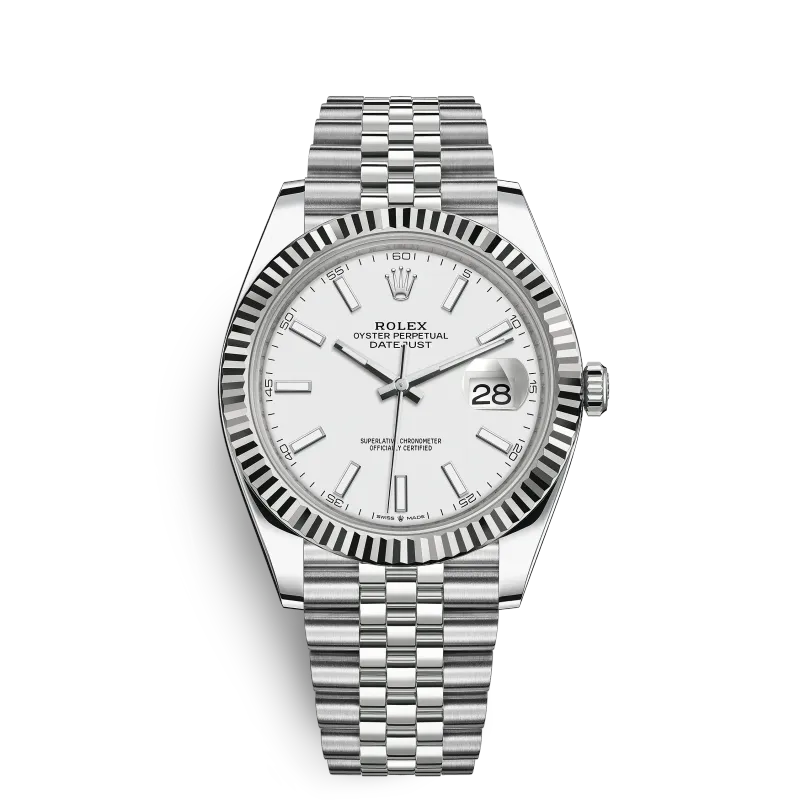THIS OYSTER PERPETUAL DATEJUST 41 IN OYSTERSTEEL AND WHITE GOLD FEATURES A WHITE DIAL AND AN OYSTER BRACELET.