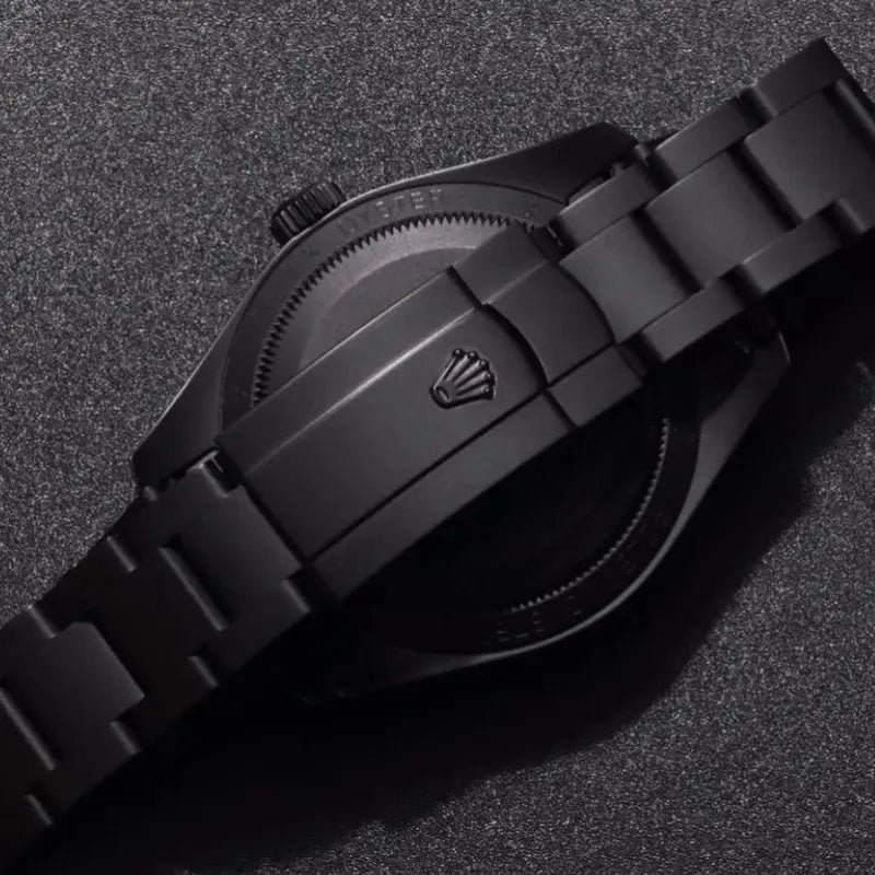 There is a special black coating on the case and chain strap, so that the whole watch looks like a foggy black fashion style. Since the base 116400 of the watch is the version before the green glass is replaced, the edge of the mirror surface will not show through. The green light of the signboard. As for the dial, this watch changed its dial to dark gray with the blackening of the case. In addition, the luminous paint on the hour markers and hands was also changed to black, and the original orange lightning needle of the watch was also changed.
