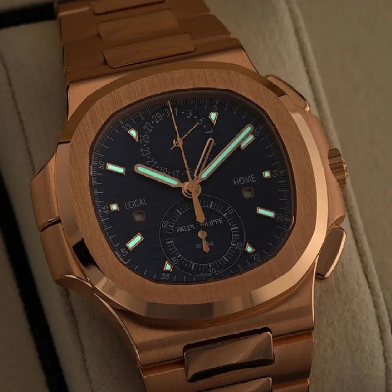 That familiar Nautilus bump is actually two buttons. The travel hand jumps with each press of the button and can easily be set to the local time in your destination, or simply hidden beneath the main hour hand when you don’t need to track a second time zone.