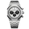 The powerful aesthetics of the Royal Oak’s signature stainless steel case, octagonal bezel and integrated bracelet, matched with a very contemporary two-tone dial, with silvered “Grande Tapisserie” pattern and expanded black chronograph counters at 9 o’clock and 3 o’clock.