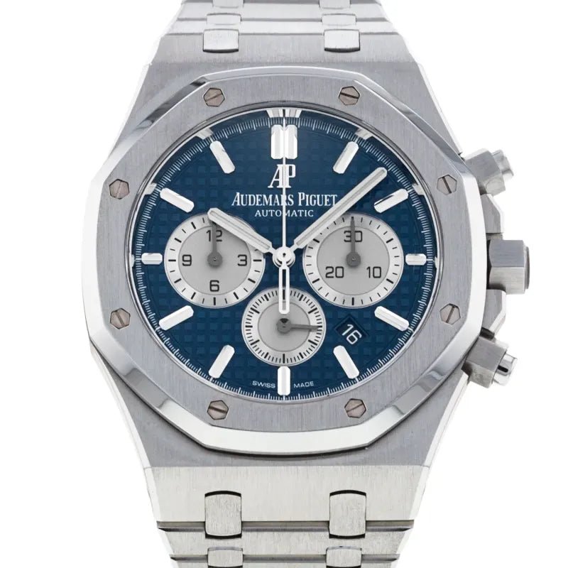 Silver-toned dial with “Grande Tapisserie” pattern, black counters and extern zone, white gold applied hour-markers and Royal Oak hands with luminescent coating.