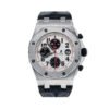 Audemars Piguet Royal Oak Offshore 26170ST.OO.D101CR.02 Mens Watch. 42mm stainless steel case. Stainless steel octagon shaped bezel. Silver Mega Tapisserie dial with steel hands and Arabic numeral hour markers. The date is displayed at 3 o’clock. Three black sub-dials. Small seconds hand at 12 o’clock. 30-minute counter at 9 o’clock. 12-hour counter at 6 o’clock. Black leather strap with stainless steel deployment buckle. Will fit up to a 7-inch wrist. Sapphire crystal. Stainless steel case back. Automatic self-winding movement. This watch comes with original Papers.