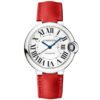 Ballon Bleu de Cartier watch, 36 mm, mechanical movement with automatic winding. Steel case, fluted crown set with a synthetic cabochon-shaped spinel, silvered guilloché opaline dial, Roman numerals, blued-steel sword-shaped hands, sapphire crystal, two calfskin straps, steel double adjustable folding buckle. Case dimensions: diameter: 36.6 mm, thickness: 12.05 mm. Water-resistant to 30 metres.