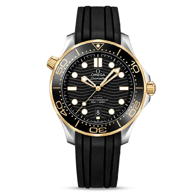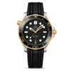 The watch is presented on a black rubber strap and is driven by the OMEGA Master Chronometer Calibre 8800, which can be seen through the sapphire-crystal on the wave-edged caseback.