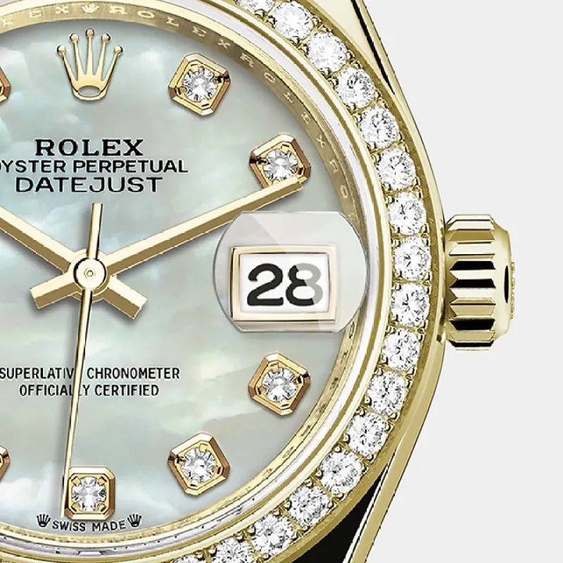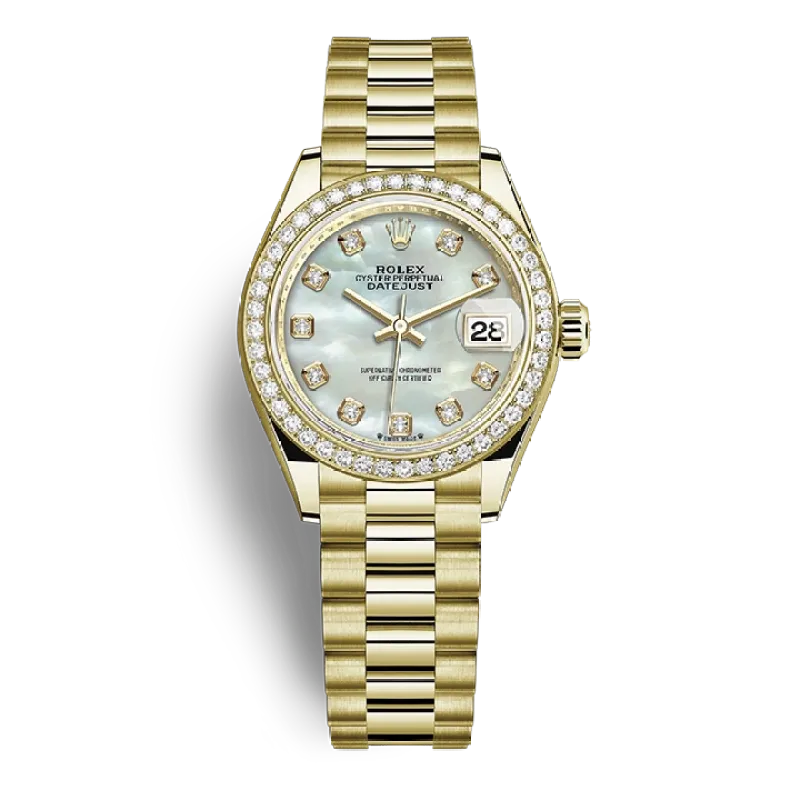 The light reflections on the case sides and lugs highlight the elegant profile of the 28 mm Oyster case, which is fitted with a diamond-set bezel. Rolex’s classic feminine watch, the Lady-Datejust is in the lineage of the Datejust, the emblematic model that has been a byword for style and accurate timekeeping.
