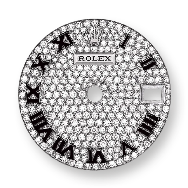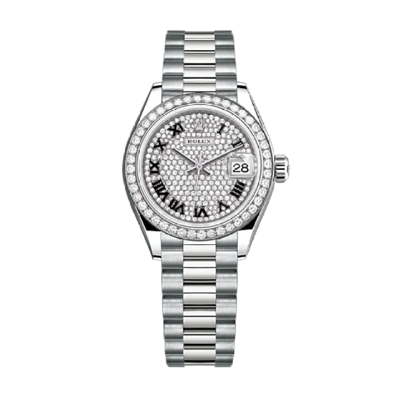 THIS OYSTER PERPETUAL LADY-DATEJUST IN 18 CT WHITE GOLD FEATURES A DIAMOND-PAVED DIAL AND A PRESIDENT BRACELET.