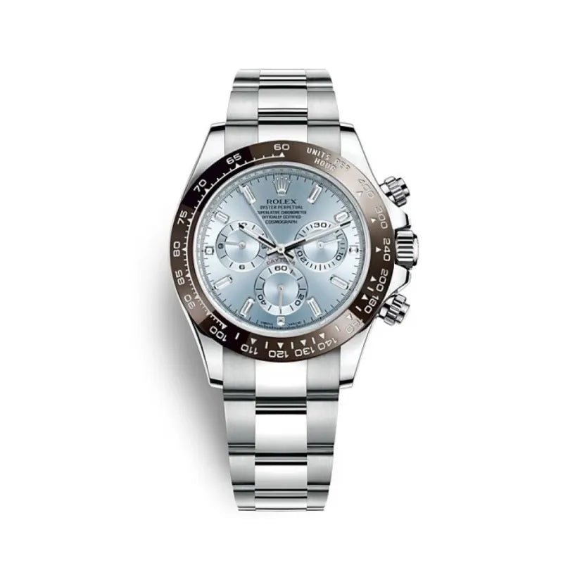THIS OYSTER PERPETUAL COSMOGRAPH DAYTONA IN PLATINUM WITH AN ICE-BLUE DIAL AND AN OYSTER BRACELET, FEATURES A CHESTNUT BROWN CERACHROM BEZEL WITH TACHYMETRIC SCALE.