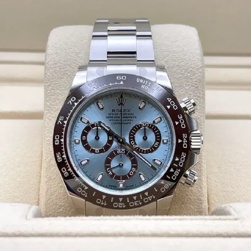 Hands-on look at the Rolex Cosmograph Daytona 116506 platinum watch with brown ceramic bezel and ice blue dial.