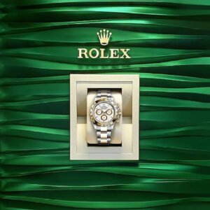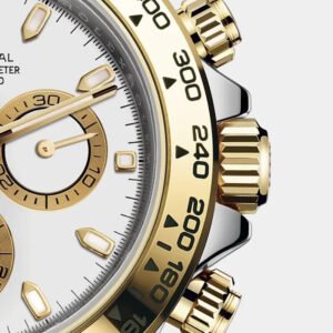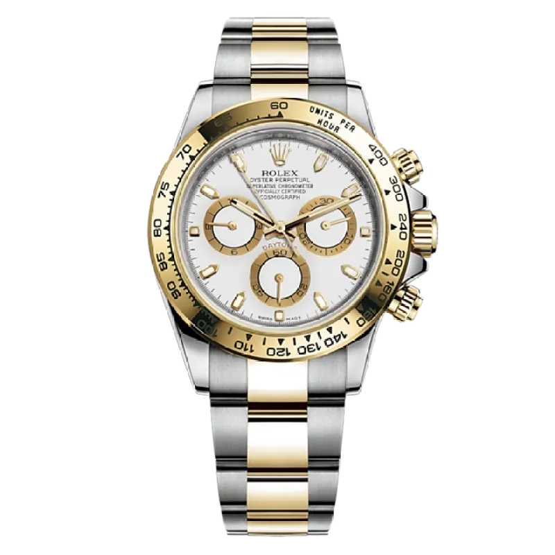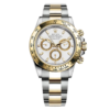 THIS OYSTER PERPETUAL COSMOGRAPH DAYTONA IN OYSTERSTEEL AND YELLOW GOLD, WITH A WHITE DIAL AND AN OYSTER BRACELET, FEATURES A YELLOW GOLD BEZEL WITH ENGRAVED TACHYMETRIC SCALE.