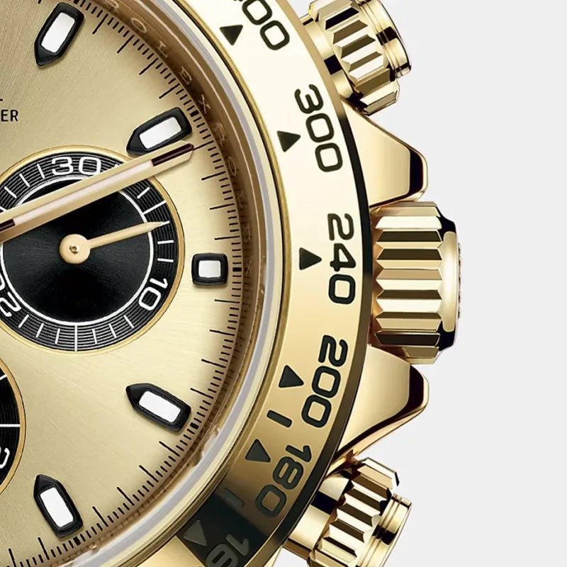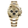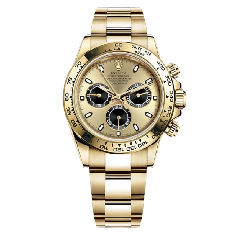 THIS OYSTER PERPETUAL COSMOGRAPH DAYTONA IN 18 KT YELLOW GOLD, WITH A GOLDEN AND BLACK DIAL AND AN OYSTER BRACELET, FEATURES 18 KT YELLOW GOLD BEZEL WITH ENGRAVED TACHYMETRIC SCALE.
