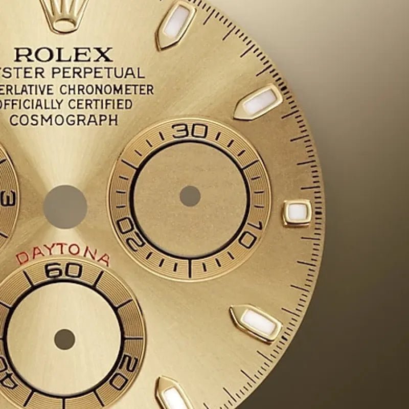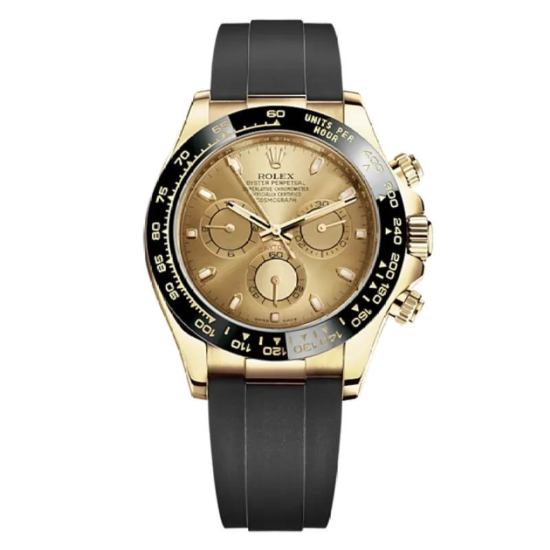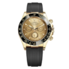 THIS OYSTER PERPETUAL COSMOGRAPH DAYTONA IN 18 KT YELLOW GOLD WITH A CHAMPAGNE-COLOUR DIAL AND AN OYSTERFLEX BRACELET, FEATURES A BLACK CERACHROM BEZEL WITH TACHYMETRIC SCALE.