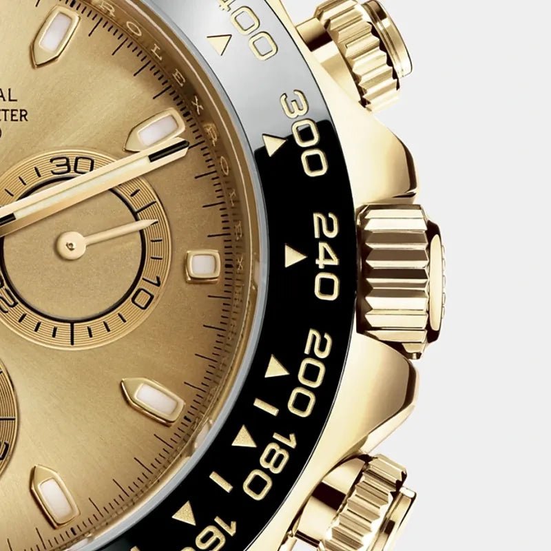 - Black monobloc Cerachrom bezel in ceramic with moulded tachymetric scale