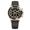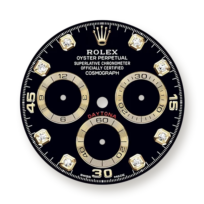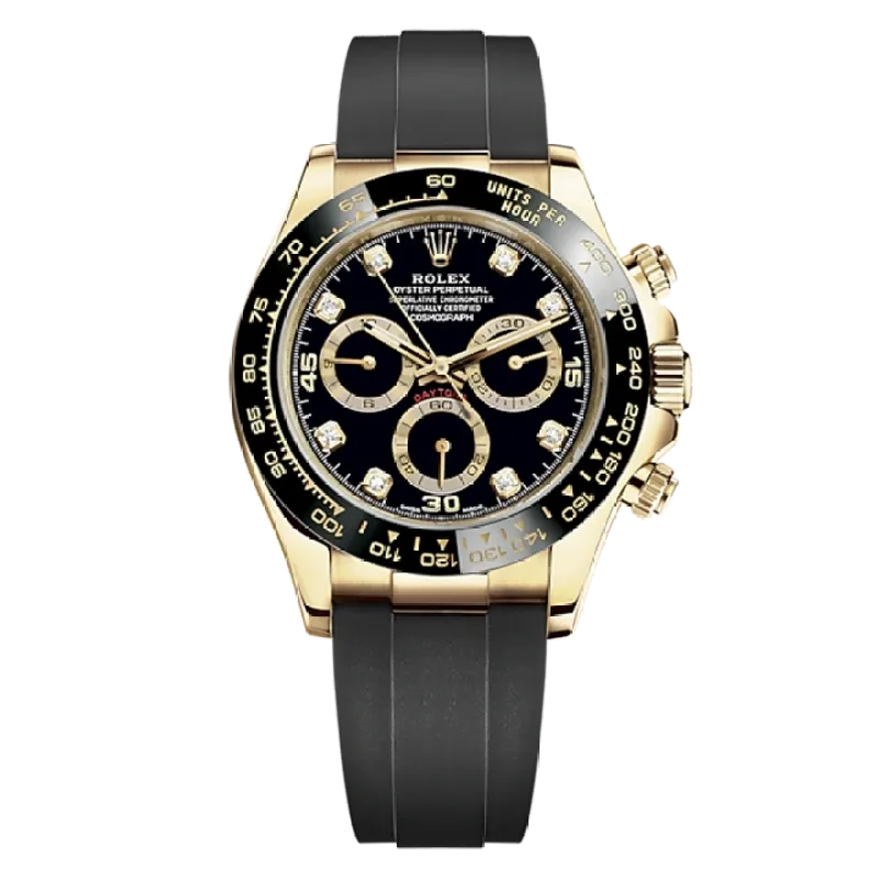 THIS OYSTER PERPETUAL COSMOGRAPH DAYTONA IN 18 CT YELLOW GOLD WITH A BLACK, DIAMOND-SET DIAL AND AN OYSTERFLEX BRACELET, FEATURES A BLACK CERACHROM BEZEL WITH TACHYMETRIC SCALE.