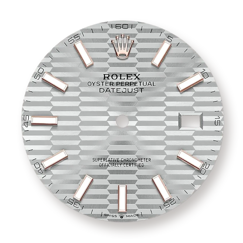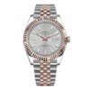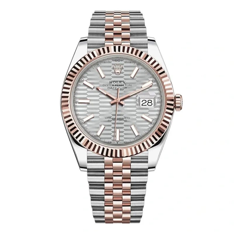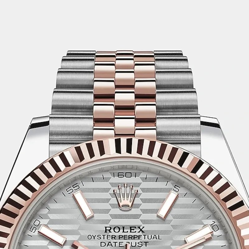 THIS OYSTER PERPETUAL DATEJUST 41 IN OYSTERSTEEL AND EVEROSE GOLD FEATURES A SILVER, FLUTED-MOTIF DIAL AND A JUBILEE BRACELET.
