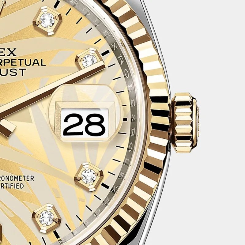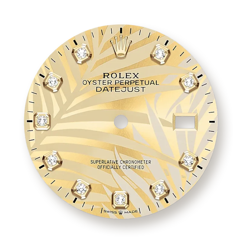 Its dial features diamonds in 18 ct gold settings. The light reflections on the case sides and lugs highlight the elegant profile of the 36 mm Oyster case, which is fitted with a fluted bezel. Aesthetically, the Datejust has spanned eras, while retaining the enduring codes that make it, notably in its traditional versions, one of the most recognized and recognizable of watches.
