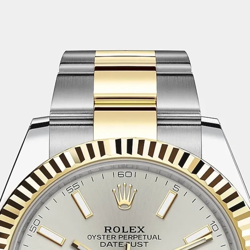 THIS OYSTER PERPETUAL DATEJUST 41 IN OYSTERSTEEL AND YELLOW GOLD FEATURES A SILVER DIAL AND AN OYSTER BRACELET.
