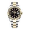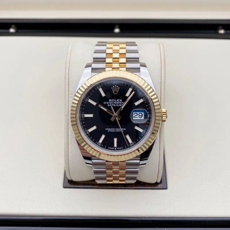 THIS OYSTER PERPETUAL DATEJUST 41 IN OYSTERSTEEL AND YELLOW GOLD FEATURES A BRIGHT BLACK DIAL AND A JUBILEE BRACELET.