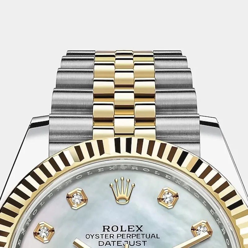 THIS OYSTER PERPETUAL DATEJUST 41 IN OYSTERSTEEL AND YELLOW GOLD FEATURES A WHITE MOTHER-OF-PEARL, DIAMOND-SET DIAL AND A JUBILEE BRACELET.