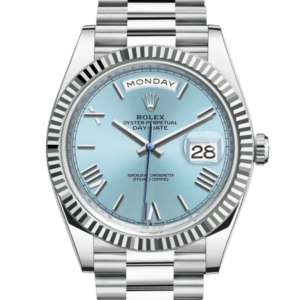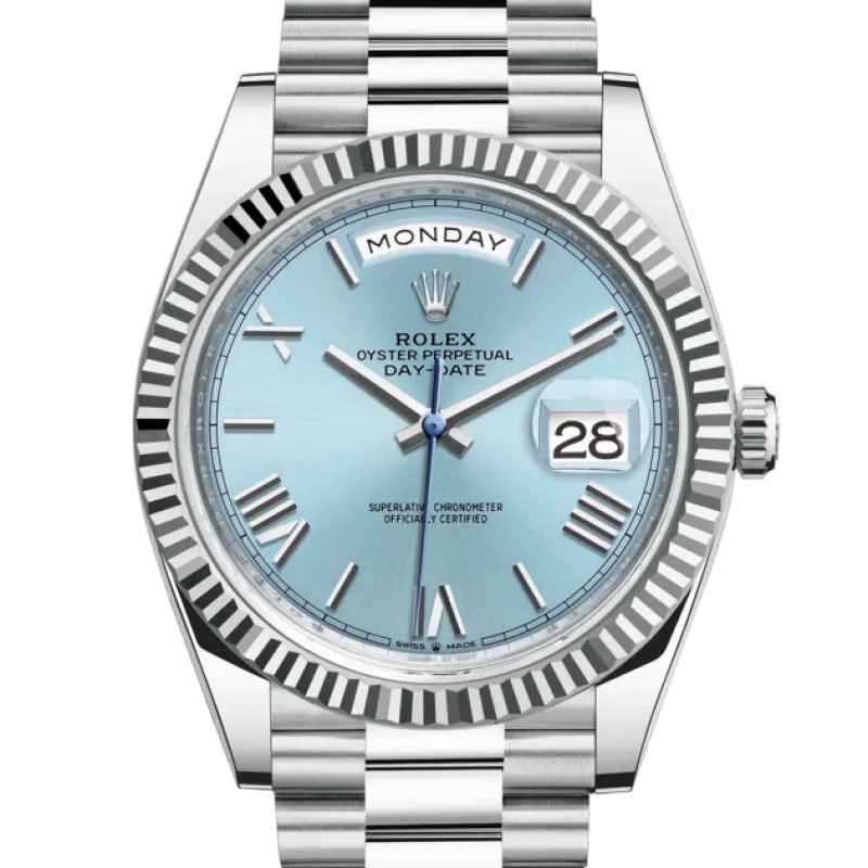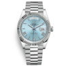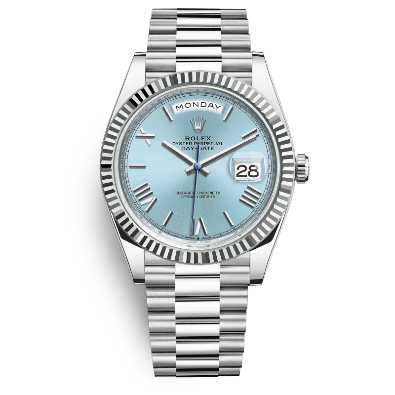 The dawn of a new day. The platinum Day-Date 40 featuring an ice-blue dial with faceted Roman numerals, fluted bezel, and fitted with the President bracelet.