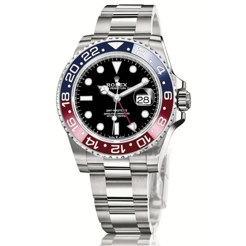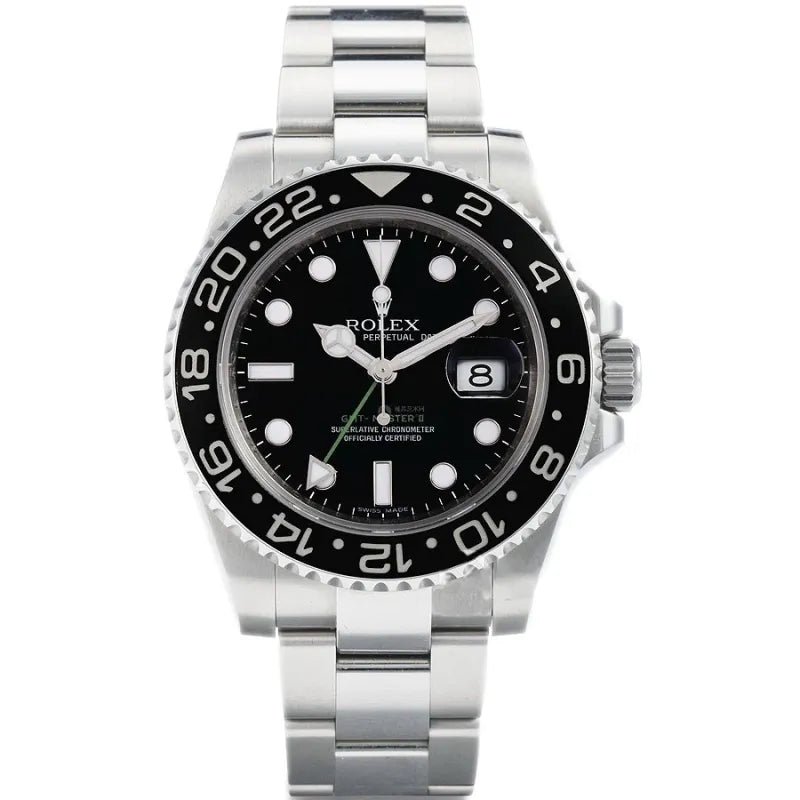 In addition to conventional hour, minute and seconds hands, the GMT-Master II features an arrow-tipped hand, which circles the dial once every 24 hours, as well as a bidirectional rotatable 24-hour graduated bezel.