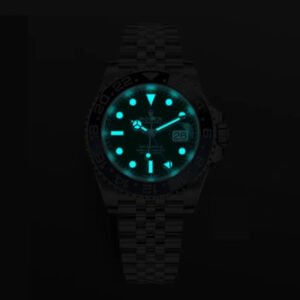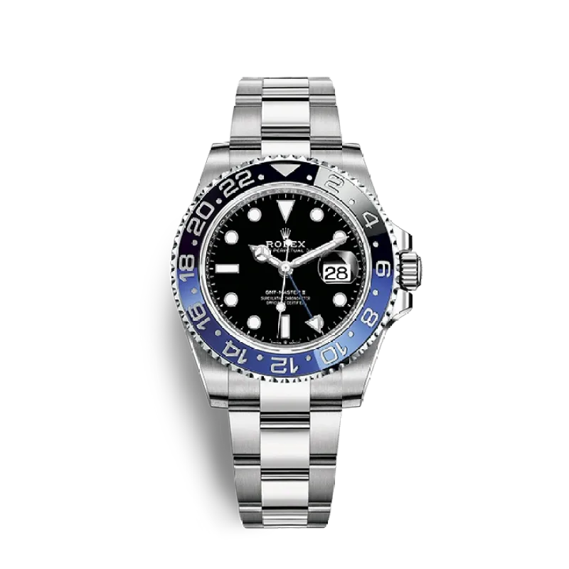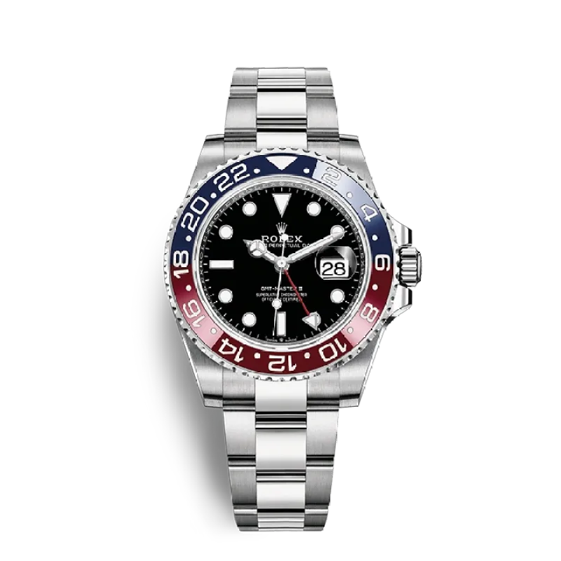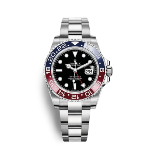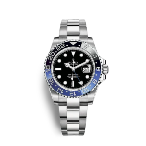 This model features a black dial and a two-colour Cerachrom bezel insert in red and blue ceramic. Designed to show the time in two different time zones simultaneously during intercontinental flights, the GMT-Master II has come to be recognized for its robustness and versatile appearance.